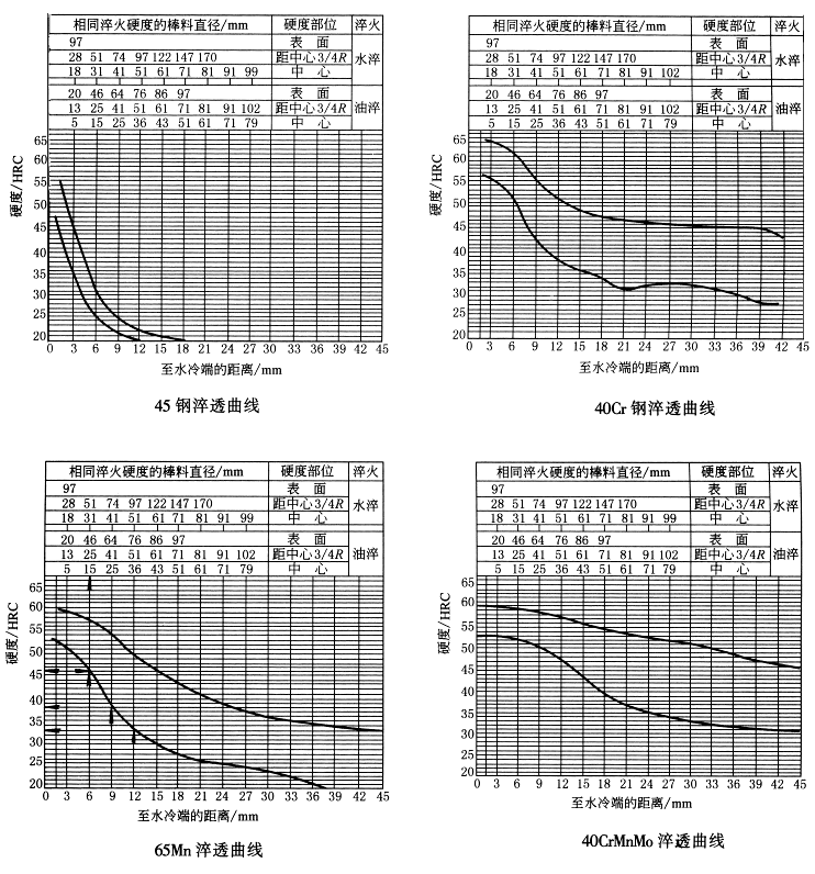 淬透性曲线一般都要实测,也可根据炉号成分按统计公式计算: 当C≤0.28%:J6~40=87C+14Cr+5.3Ni+29Mo+16Mn-17 当C≥0.29%:J6~40=78C+22Cr+21Mn+6.9Ni+33Mo-16.3 J6~40表示试样端淬距离d在6~40mm范围内时任一d值部位的硬度HRC;d为端淬距离,即至水冷端的距离(mm)。公式适用于含0.1%~0.6%C, 0.2%~1.88%Mn,0~9%Ni,0~1.97%Cr,0~0.53%Mo,0~3.8%Si的钢种 |