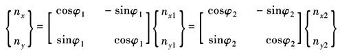 图2 将C1、C2及公法矢利用坐标变换(式2a)及(式3)变换到固定坐标系xOy中,由C1、C2上两点接触时在xOy中处于同一点并具有相同法矢,于是有: