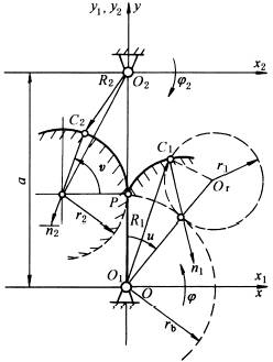 得到ω2=dφ2/dt=fω(φ1、ω1、u')的表达式。将υ=f(u,φ2±φ1)代入(式2)所得的二个投影式分别对φ1、t求二阶导数可分别得到i'21=di21/dφ1、u" 及ε2= 段曲线组成的,例如凸轮机构中凸轮廓线由停-推-停-回-停四段曲线组成,而瞬心线机构的构件廓线通常也是几段曲线组成的封闭或不封闭曲线,齿轮的廓线则是1~2段曲线组成的呈周期性排列的曲线,分析时并不需要分析整条曲线。为了说明方法如何应用,现举例如下 例 齿廓分别为外摆线和圆的齿轮1和2,各自绕固定中心O1、O2转动,中心距为a,在初始位置二者相切于点P(图2),已知轮1的角速度为ω1,角加速度为ε1,试求轮2的ω2和ε2 解:如令u、υ分别表示轮1、2的变量参数,rb、r1表示轮1的基圆半径和滚圆半径,且有r= r1 +rb、 的径矢和公法矢。
