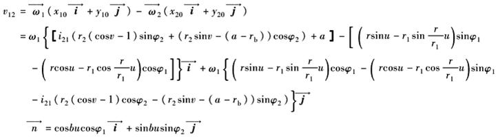 式中 nx、ny;nx1、ny1;nx2、ny2—— 高副元素接触点的公法矢分别在固定坐标系与动坐标系1和2中沿x、y方向的分量。对平面曲线有:nx1= (式2)和(式3)共给出了三个标量方程,联系着u、υ,φ1和φ2四个未知量,对单自由度机构通常φ1(或S1)是自变量,因而给定一个φ1值便可求得相应的φ2、u、υ值和φ2=φ2(φ1)的转角关系。通常联系着u、υ,φ1、φ2的三个纯量超越方程式,不易写出显式表达式,宜用数值计算法求解。通常由(式3)可以得到υ=f(u,φ2±φ1)的关系,将此关系代入(式2)所给出的二个投影方程式,它是φ1、φ*=φ2±φ1、u及定长参数的二个纯量方程,给定φ1便可求得u及φ*(或 φ2)。如定义��