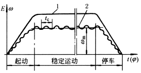 在起动阶段,机器存在着较大的加速度以及由其惯性所引起的附加动载荷,很容易引起机件的损坏,因而对于惯性大的机器应仔细地考虑其起动方式,并设置相应的装置 在稳定运动阶段,机器主轴的运动速度为常数,即匀速运动,如图中的曲线1所示(例如电动机、鼓风机等),或在其正常工作速度相对应的平均值ωm的上下作周期性(周期为tc)变动,即变速运动,如图中曲线2所示(例如各种活塞式原动机和工作机)。这是机器的正常工作阶段,其运动特性应满足工作机械的要求 |
