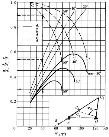 例:已知φ12=180°,Y12=40°,γmin=50°,决定各杆的相对长度 解 查右图得, |