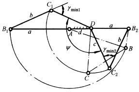 右图表示出双曲柄机构的两个位置AB1C1D及AB2C2D,此时具有两个最小传动角(γmin1、γmin2)。在这两位置之间输入杆AB转180°,输出杆DC转Y角度。为了达到最佳传动条件,给定Y时,要求两个传动角的极小值相等。按最小传动角设计双曲柄机构时,用线图按最小传动角设计双曲柄机构的线图a、b、c分别根据给定的Y及γmin值,求得a/d、b/d及c/d三个相对长度值。其中d为机架AD的长度,a为输入杆AB的长度,c为输出杆CD的长度,b为连杆BC的长度 例:设计一双曲柄机构、已知Y=100°及γmin=35° 解 查图按最小传动角设计双曲柄机构的线图a、b、c得
