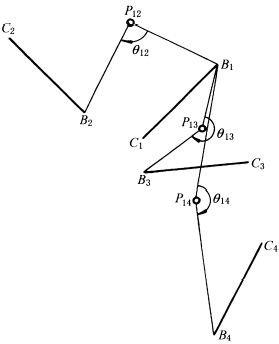 1.根据已知的B1C1、B2C2、B3C3及B4C4的位置,用作图法求出其转动极P12、P13、P14和连杆的角位移θ12、θ13、θ14(图1) |