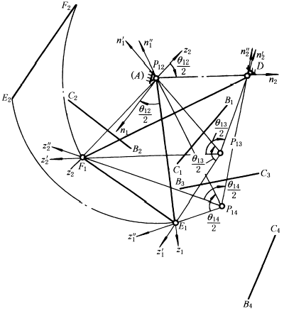 3.把上述三个角度∠θ12/2、∠θ13/2、∠θ14/2做成透明纸样板∠P12、∠P13、∠P14,分别以P12、P13、P14为中心转动样板试凑,使z1、z'1、z"1汇交于一点E1,同时n1、n'1、n"1汇交于另一点A,就得到一组对应的动铰链E1及固定铰链A的位置 |