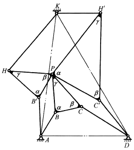在机构设计时,有时会发现设计所得的四杆铰链机构虽然能实现预期的连杆上点的轨迹,但是固定铰链及动铰链不能很方便地安装在机器里,或者传动角很不恰当。遇到这些问题时可以应用重演同样连杆曲线有三个相当机构的原理(罗培兹定理),尝试采用另外两个相当机构来解决上述问题。相当机构的作图法如下(右图): (1)已知四杆铰链机构ABCD及连杆上一点P,以AD为底边作三角形ADK与三角形BCP相似; (2)作平行四边形AB'PB,作三角形B'PH与三角形BCP相似,AB'HK即为机构ABCD的一个相当机构,P点为连杆B'H上的一点; (3)作平行四边形DCPC',作三角形PC'H'与BCP相似,KH'C'D为机构ABCD的另一个相当机构。P点为连杆C'H'上的一点 |