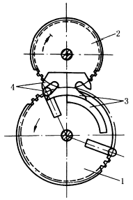 图1 外啮合式不完全齿轮机构 1—主动轮;2—从动轮;3—锁止弧;4—缓冲结构 |