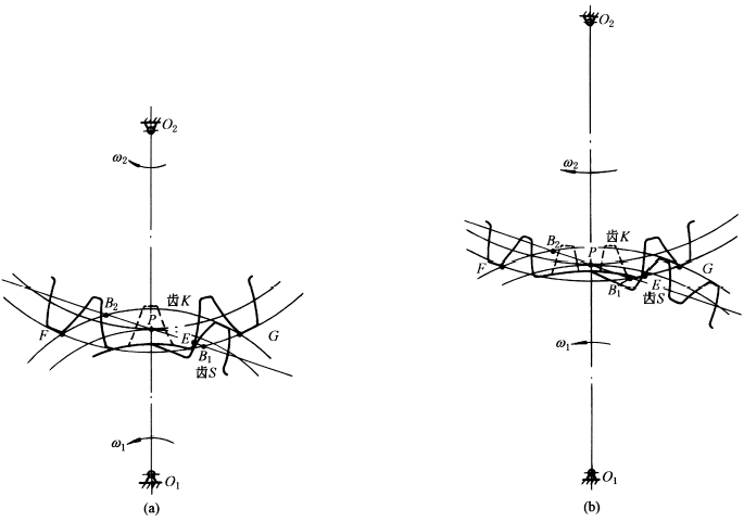 末对齿:末对齿啮合至B2点时,因无后续齿所以并不立即脱啮,而以主动齿顶尖角与从动末齿根部啮合,经圆弧段 中间各对齿开始啮合于B1点,终止啮合于B2点 仅由一对齿啮合来完成一次间歇运动时,啮合轨迹的前半段EB1P(或EP)与首对齿的前半段相同;后半段PB2F与末对齿的后半段相同 同时看到,由于啮合轨迹较长,每次间歇运动中,从动轮所转过的角度较大,其中包含的周节数为z2 z2= z1-1+K 式中 z1—— 一次间歇运动中,主动轮转过的齿数; K—— 锁止弧覆盖部分所包含的周节数加上0.5,一般K取整数。当z1=1时,从动轮每次转过K个周节 |