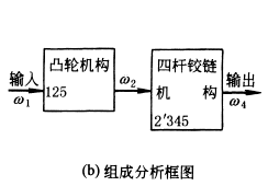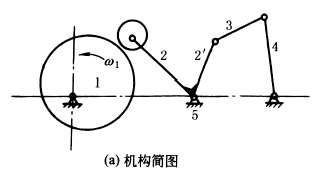 上图为由凸轮机构125和四杆铰链机构2'345串联组成的凸轮-连杆组合机构。主动构件为凸轮1、凸轮机构的滚子摆动从动件2与四杆机构的输入件2' 固连,输入运动ω1,经过二套基本机构的串联组合,由杆4输出运动ω4。 |