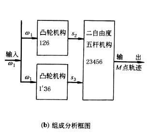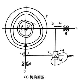 上图为一并联式凸轮-连杆组合机构。凸轮1和1' 装在同一轴O上,输入运动ω1后,经过二套并联的凸轮机构126和1' 36,分别输出x方向的运动s2和y方向的运动s3,s2和s3使二自由度五杆机构23456的构件4和5的铰接点M走出工作所需要的轨迹mm。 |