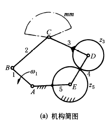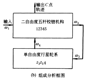上图所示为一反馈型的复联式齿轮-连杆组合机构,它是由一个二自由度的五杆铰链机构12345和一单自由度行星轮系z3z54所组成。行星轮z3与连杆3固连,其中心与杆4在D点铰接。中心轮z5与机架5固连不动,其中心与杆4在E点铰接。输入运动为ω1,经过这两套基本机构的反馈型复联组合,使杆2和3的铰接点C输出工作所需要的运动轨迹mm。 |