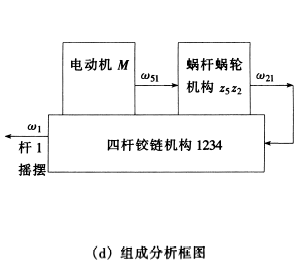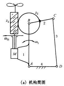 图所示为一装载型的复联式齿轮-连杆组合机构,即电风扇上的自动摇头机构。它是由一蜗杆蜗轮机构z5z2装载在一双摇杆机构1234上所组成,电动机装在杆1上,驱动蜗杆z5和风扇,蜗轮z2与连杆2固连,其中心与杆1在B点铰接。当电动机M带动风扇以角速度ω51转动时,通过蜗杆蜗轮机构使摇杆1以角速度ω1来回摆动,即使风扇头摇摆。 |