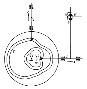 ④作出凸轮的理论廓线和工作廓线。按凸轮轮廓设计的反转法原理,根据位移曲线sx-f1和sy-f '1分别作出移动从动件盘形凸轮1和1' 的理论廓线(图2d)。然后在理论廓线上作一系列滚子圆,其内外包络线即凸轮的工作廓线(图中未画出)。 |