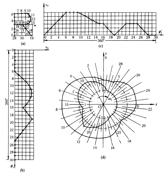 ③选定凸轮1和1' 的起始位置并作出其一圈中的各等分角。图(2)d中,取凸轮1的起始位置f10为Ox方向,取凸轮1' 的起始位置f '10为Oy方向。逆凸轮ω1方向各取一圈30个等分角线。 |