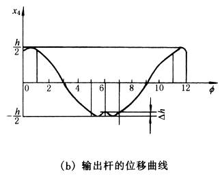 式中 H—— 转臂的长度,当f=0时,x4=H-r3;f=π 时,x4=-(H-r3)。 行程 h=(H-r3)+(H-r3)=2(H-r3) (6) 图(1)b为转臂H转一周中输出杆4的位移曲线x4=f(f),此机构取K=2。 ④输出杆4的速度υ4和加速度a4。