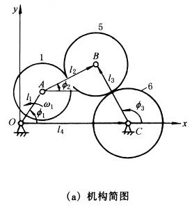图(3)a所示的外啮合用正号,图b所示的内啮合用负号。 5)齿轮6输出的运动规律为无停歇点的单向不匀速转动时的条件是:在主动件1的转角f1从0→2π中的任一位置时均应满足Δ(或Δ' )>0。 6)齿轮6输出的运动规律为有一个瞬时停歇点的单向不匀速转动的条件,是在主动件1的某一转角位置f1时出现Δ(或Δ' )=0。 7)齿轮6输出的运动规律为在m和n时出现两个瞬时停歇点的条件是在主动件1的某二个转角位置时(对应m和n),出现Δ(或Δ' )=0,且在mn区间内满足Δ(或Δ' )<0。 8)机构中各尺度参数对运动的影响。根据分析,在这种组合机构中,如果连杆机构的各杆长度不变,只改变齿轮的齿数,则输出齿轮的运动规律变动不大。但杆2和3的长度与齿轮的节圆半径间有一定几何关系,即图(1)所示型式:l2=r1+r5,l3=r5+r6;图(3)a所示型式:l2=r1+r5,l3=r'5+r6;图(3)b所示型式:l2=r2+r5,l3=r6- r'5。故这种组合机构的主要设计变量为主动曲柄的长度l1和机架的长度l4。一般设计时可先定l1,然后再求l4。 l4=l4min时,轮6出现一个瞬时停歇点;l4>l4min时,轮6有可能出现二个瞬时停歇点;l4<l4min时,轮6只是变速无停歇。 9)能出现瞬时停歇点的条件是l4=l4min。