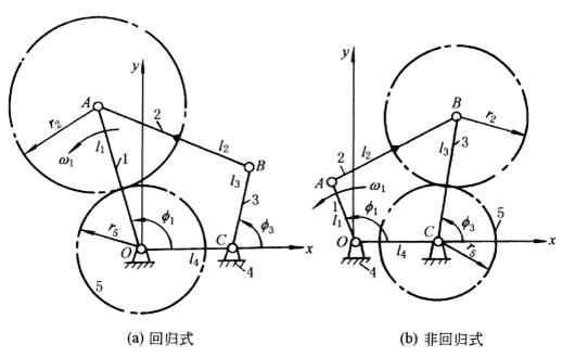 如图(4)所示为四杆铰链机构与周转轮系组成的组合机构,主动件为曲柄1,连杆2上固连有齿轮2,输出件为齿轮5。这种组合机构有二种形式:①回归式(输出轮5与主动件1共轴线);②非回归式(输出轮5与杆3共轴线)。根据四杆机构各杆的尺度和齿轮齿数的不同配合,当主动曲柄以等角速度ω1连续旋转时,输出轮5可获得如图(2)所示的不同运动规律。这种组合机构的设计步骤和方法如下。 1)由周转轮系的角速比公式及其对时间的积分和微分可求得输出齿轮5的角位置f5、角速度ω5和角加速度ε5。 回归式(图4a):f5=f50+(1+i)(f1-f0)-i(f2-f20) (19) ω5=(1+i)ω1-iω2 (20) ε5=(1+i)ε1-iε2 (21) 非回归式(图4b):f5=f50+(1+i)(f3-f30)-i(f2-f20) (22) ω5=(1+i)ω3-iω2 (23) ε5=(1+i)ε3-iε2 (24) 式中 i—— 齿数比, f10、f20、f30、f50—— 杆1、2、3和轮5的起始位置角; f2、f3、ω2、ω3、ε2、ε3—— 杆2和3的位置角、角速度和角加速度,由四杆铰链机构OABC求得,可按式(1)~式(6)计算。 2)输出齿轮5具有瞬时停歇特性时的条件,根据机构各构件间的运动关系,以及瞬时停歇时,ω5=0,ε5=0的条件,可由下列非线性方程组联立求解: 回归式: