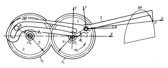 图所示为由一对齿数相同的定轴齿轮机构1、2和凸轮3所组成,槽凸轮3与齿轮1在A点铰接,齿轮2上装有柱销B,它在凸轮3的曲线槽中运动。当主动齿轮1以等角速度ω1连续转动时,作平面复合运动的凸轮3上某一点P沿轨迹pp运动。这种组合机构设计时,主要是设计凸轮槽的廓线形状,其设计的步骤和方法如下。 ①在机架上建立定坐标系OXY,按工作要求画出轨迹pp,并列出pp在OXY中的方程式或离散坐标数据(Xp,Yp)。一般取定坐标的原点O与主动齿轮轴心O1重合,X轴沿连心线O2O1。 ②在凸轮3上建立动坐标系oxy,取动坐标系oxy的原点o与A点重合,x轴沿AP。 ③两坐标系中x轴与X轴间的夹角θ。