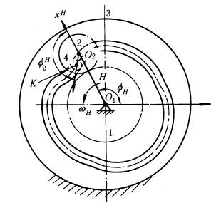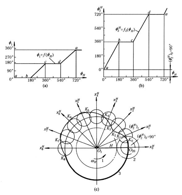 图(1)为一由周转轮系和固定凸轮组成的组合机构。周转轮系中的转臂H为主动件,输出齿轮为中心轮1,1与H共轴线O1,在行星轮2上固连有滚子4,它在固定凸轮3的曲线槽中运动。当主动件H以等角速度ω1连续旋转时输出齿轮1能实现周期性的具有长区间停歇的步进运动。这种组合机构中,由于凸轮可控制行星轮的运动,对输出轴有一定的运动补偿,因此在许多机械中,常采用这种固定凸轮-周转轮系组合机构的原理来设计校正装置。这种组合机构的设计步骤和方法如下。 1)给定工作所需要的输出轮1的运动规律f1=f1(fH)。例如图(2)a所示,主动转臂H转二周,输出轮1按停-等速转动-停-等速转动的规律转过一周。