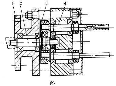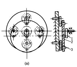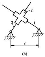 下图a主动曲柄1转动时,带动盘2作平移运动,从而同时带动四个等长曲柄3各绕自己的固定轴心作同速转动。此机构允许有较小的主、从动轴轴距。多头钻、多头铣等均可应用这种机构。当转速较高时应注意平衡。图b为多头钻的结构实例。主动偏心轴2通过圆盘3带动与2有相同偏心距e的钻杆4转动。 |