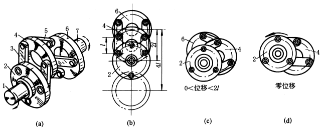下图圆盘2、4、6的等径圆周上各有三个等间隔的销轴,分别以三个长度为l的连杆相互铰接,形成多个平行四边形机构(图a)。主动轴1的转动通过中间圆盘及连杆使从动轴7作同速转动。这种机构可在运转中改变主、从动轴间的距离(最大轴距为2l,从动轴最大位移为4l,图b、c、d)。运转时盘4的中心具有不变的确定位置,仅在主、从动轴线重合时(零位移位置,图d),盘4处于位置不确定状态,故应避免使用这个位置。 |