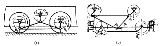 下图a,电机带动的主动轴O与两从动轴O1、O2均在同一车架上,且OO1=OO2;曲柄OA=O1B1=O2B2,连杆AB1=AB2=OO1。 图b,O1O2=A1A2、O3O4=B1B2、O1A1=O2A2=O3B1=O4B2,电机带动的主动轴O1(或O2)与车架1为一体,并支承在弹簧2上,使车架有减震缓冲作用,随着运行中的振动,引起O1O2与O3O4间的距离发生变化,图中在两个平行四边形机构中增加杆A3B3可补偿主、从动轴间距离的变化。 |