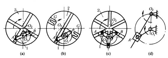 如下图所示,主动曲柄1绕O1转一周,从动圆盘2绕O2转半周。机构各构件的尺寸应有下列关系:曲柄长度等于中心距,即O1A(=O1B=O1C)=O1O2。 图a,主动双臂曲柄1两端铰接的滑块在从动盘的十字槽中滑动。图b,从动盘2上有一个径向槽和两个辅助槽G,当销B进入辅助槽时使机构顺利通过死点。图c,从动盘2上有三个径向槽,用三臂曲柄传动,传递力矩较均匀。图d,为这种导杆减速机构的结构简图。这种机构结构简单,并可将曲柄做成圆盘形以传递较大的载荷。 |