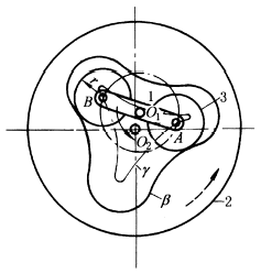 下图中,两端带滚子3(分别绕A、B轴转动)的双臂主动曲柄1绕固定轴O1转动,通过滚子3带动从动盘2绕固定轴O2同向转动,滚子3的中心A和B相对于圆盘2的运动轨迹为摆线γ,圆盘2的内缘曲线为γ的等距曲线β(距离等于滚子半径r)。这种机构中心距O1O2不能太大,否则γ曲线将出现交叉,O1O2的最大值为O1A/2,这时,曲柄1转一周,盘2转2/3周。 |