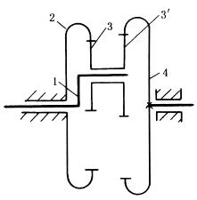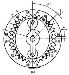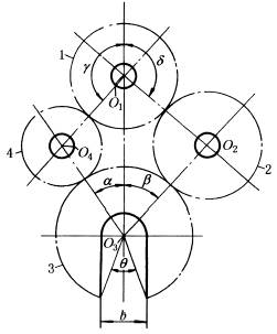 右图中,主动齿轮1经惰轮2、4带动从动轮3,这种机构由于采用了功率分流传动,可以减小机构体积和重量。此外,在某些机械中,由于生产上要求从动轮3上开有宽度为b的钳口槽(如石油钻井旋扣器)。采用这种机构能保证从动轮3作整周回转。设计时应注意以下各点: ①保证正确的安装条件: α(z3-z4)+γ(z4-z1)+β(z3-z2)+δ(z2-z1)=2πk 式中 k—— 应为正整数; z1、z2、z3、z4—— 各齿轮齿数。 ②O1O3>(d1+d3)/2;O2O4>(d2+d4)/2 式中 d1、d2、d3、d4—— 各轮的齿顶圆直径。 ③槽宽b所对中心角θ<α+β |