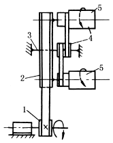 右图中,轴3和轮4固定不动,大轮2空套在轴3上可自由转动,轮2上相隔180°对称地装有两个在销轴上可自由转动的滚筒5,5与轮4又通过传送带相连,当主动轮1通过传动带带动轮2旋转时,则滚筒5绕固定轮4公转并绕销轴自转,称为行星滚筒。这种机构常用于抛光机上。 行星滚筒5的转速按下式计算: