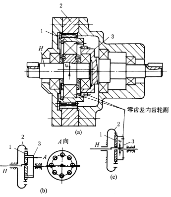 (z2-z1)点数差一般取得很小(常用差为1~4),可获得大的传动比,如z1和z2相差一个齿,则iH3=-z1(负号表示主、从动件转向相反),因此机构有传动比大,结构紧凑的优点。 轮1、2的齿廓曲线可为摆线和针齿:也可为渐开线,前者称为摆线针轮减速器,后者称为少齿差行星减速器。这类机构的主动轴转速一般可达到1500~1800r/min。若采用摆线针轮,则效率较高,功率范围也较大。 输出机构一般用销盘和孔盘组成(图b);传动功率较小时,也可采用一对齿数相等的内、外齿轮组成的零齿差输出机构(图c),为避免齿形干涉,该齿轮除径向变位外,还要切向负变位。 |