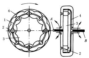 右图中,与差速器外壳固结的隔离罩1绕固定轴线B(轴线B与A重合)转动,在该隔离罩的均布径向槽内安置块状齿2,分别与凸轮盘3外缘齿和凸轮盘4内缘齿啮合,凸轮盘3和4分别固定在半轴A和B上。当差速器外壳及隔离罩转动时,将给凸轮盘3、轴A与凸轮盘4、轴B相应的驱动力矩;如两轴上所受的阻力矩相同,则它们以相同的转速回转,否则,两轴以不同的转速回转。 |
