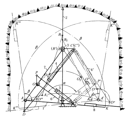下图中,为使凿岩机8在巷道断面的各个方位均能打眼,采用了由两个油缸控制的托架摆动机构。 凿岩机8打眼时,先将立柱2固定(通过气压千斤顶顶在坑道顶板上),当油缸5的活塞杆伸缩时,可使摇臂6绕E转动,并可停在α角内的任一位置,摆臂7上A、B点分别在轨迹AA1A2A' 与立柱2上占有相应位置(如A1O1B1,A2O2B2),AB位置固定后,油缸4的活塞杆可使托架1绕A点转动,并可在β角范围内任一位置停住(如AK或AK'",A'K' 或A'K"),使凿岩机8进行打眼。通过油缸4、5配合动作,可使凿岩机在坑道横断面内的三向任意方位进行打眼。 |