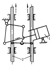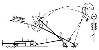 图(1)中,当供料机构处于实线位置时,铸锭6自加热炉进入盛料器4,由水压缸1的推动,机构转至位置AB'C 'D,盛料器4翻转180°,铸锭被卸在升降台7上。此双摇杆机构也用于振动造型机的翻台机构。 图(2)中,摆动气缸1的活塞杆通过连杆带动杆2上下运动,完成顶箱动作。 |