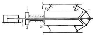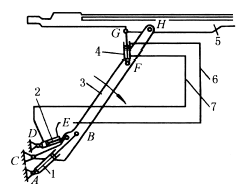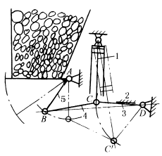 图(3)中,卷筒1是由数个围绕筒体2圆周的平行四边形机构ABCD的连杆BC组成,这些平行四边形机构的A、D与筒体2铰接。当活塞杆4向右运动时,通过连杆BE使AB、DC向右摆动,此时,卷筒1外径缩小,装上金属带卷;当活塞杆4向左运动时,AB、DC向左摆动,卷筒1外径胀大,将已装上的带卷张紧,以便松带。松带时,为使带材保持一定的拉力,利用制动器3造成一定的滑动摩擦阻力(松带时,金属带由其他装置拖动,图中未示出)。此机构在金属轧材厂的退火电炉上有应用。 图(4)中,气缸的活塞杆1通过连杆4带动闸门5开或关。实线所示位置为闸门关闭状态,此时,C点稍越过BD连线,处于上方位置,使具有自锁作用。即将关闭时,杆3、4趋近直线,有很大的增力作用,使闸门关紧。2为限位挡块。双点划线表示闸门开启状态。 |