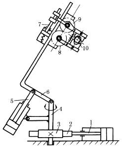 图(5)中,油缸的活塞杆1带动齿条2和齿轮3,使立轴4转动。活塞杆5使弯臂6抬起或下降。活塞杆7使互相啮合的齿轮8、9反向转动,以夹紧或松开工件10。 图(6)中,料槽杆4与油缸1的A点铰接,当油缸1不动,油缸2动作时,可使料槽绕A点摆动;当油缸2不动,而油缸1动作时,则料槽平行升降。两油缸协调动作,可使料槽得到所需的复合运动。 |