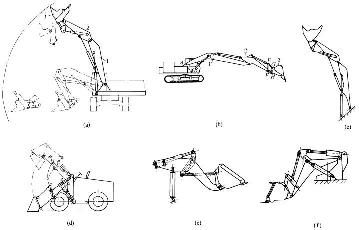 下图中a为正铲挖掘机的挖掘机构。图b为反铲挖掘机的挖掘机构。上二机构分别由大臂1、小臂2和铲斗3组成,由三个油缸驱动,能自由伸屈,便于向不同高度挖掘和卸载。图c为图a的机构简图。图d、e、f为装载机的装载机构,分别用两个油缸驱动。 |