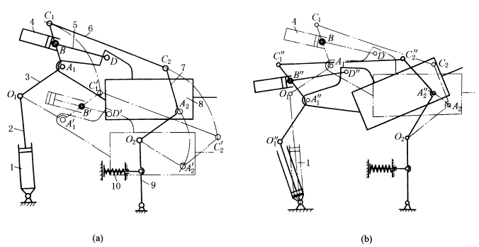 下图中,弯杆3、7的下端分别和活塞杆2,支承9铰接,而上端和连杆6铰接,二弯杆上的A1、A2与钳杆装置8铰接,弯杆3上B点与油缸4铰接,8上的D点与活塞杆5铰接。支杆9通过撑杆10保持图示位置(弹簧起缓冲作用)。分析机构运动时,O2可看成与机架的铰接点。动作从以下两种情况分别说明。 图a,当油缸1的活塞杆2不动(停止进排油),即O1点固定,此时若油缸4进油,使活塞杆5缩回,则机构位置相应运动到双点划线位置。即钳杆装置平行地下降到A'1D'A'2位置。 图b,当油缸4停止进排油,即BD长度保持不变,此时A1C1C2A2是固定的平行四边形,O1A1C1C2A2O2相当于一个构件,油缸1进油其活塞杆缩回时(设原来活塞杆是伸出状态),则钳杆装置绕O2转动一个角度,如实线位置A"1D"A2"。 工作中可通过两个油缸同时进排油来达到具体需要的位置。 |