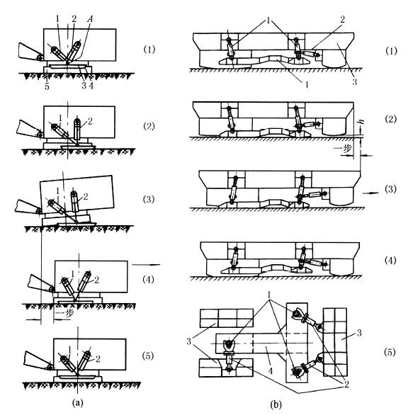 下图a为大型挖掘机步行机构。由推进油缸1、升举油缸2和靴座3共同铰接于A处组成。步行动作如下:①两油缸柱塞杆缩回,将靴座3悬起;②推进油缸1柱塞杆伸出,使靴座右移并放下;③升举油缸2柱塞杆伸出使靴座紧压土壤,并迫使挖掘机机体升起斜支在土壤上;④推进油缸1柱塞杆缩回,从而拉动挖掘机向右移动一步。至此,完成一循环,往后,重复上述循环。 图b为巨型移动式设备的步行机构。步行机构由三个竖向油缸1和三个横向油缸2与T形履板4、机座3铰接而成。步行动作如下:①右端两个油缸2的柱塞杆缩回,将悬挂的履板4向右拉;②三个油缸1的柱塞杆伸出,将履板4放下,并将机座3举高离地h;③右端两个油缸2柱塞杆伸出,将升举的机座向右推移一步;④三个油缸1的柱塞杆缩回,放下机座并提起履板,至此,完成一个循环。往后,重复上述循环。如需要转向,由三个横向油缸协同动作,使T形履板在平面上转动一个角度即可。这一步行机构应用于移动式破碎机组等巨型设备上,移动总重可达250t或更大。 |