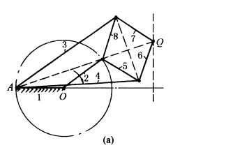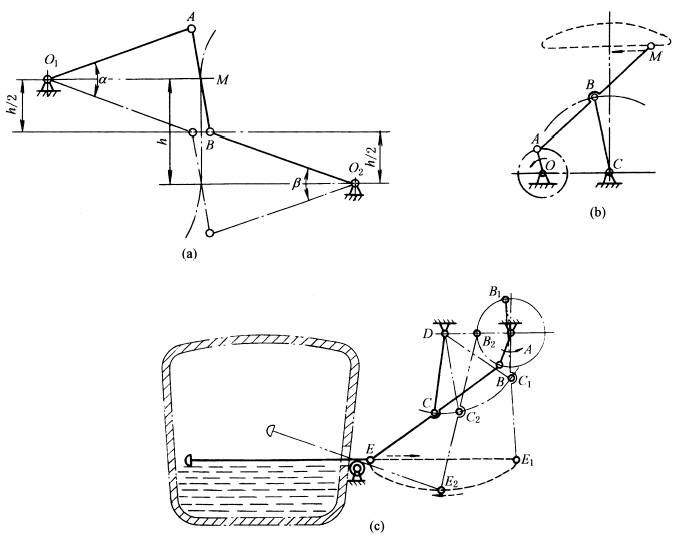 下图a取AB=h、O1A=O2B=1.5h,则AB中点M在行程为h范围内(相应摆角α=β≈40°)的轨迹近似直线。图b所示机构,当AB=BC=BM=2.5OA,OC=2OA,则OA绕O点转动,A点在左半圆时,M点的轨迹为近似直线。图c是扒渣机,是图b的具体应用实例。 |