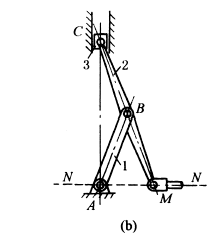 下图a,机构尺寸满足关系:L1=L2、L3=L4、L5=L6=L7=L8,当杆2转动时,Q点的轨迹为垂直于OA的一条直线。 图b,机构尺寸满足关系:AB=BC=BM,当滑块3沿垂直线上下滑动时,杆2端点M沿水平线NN作精确直线运动。 |
