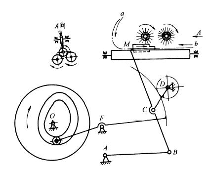 下图中,洗瓶机中的推瓶机构要求推头M自a沿轨迹以较慢的匀速推瓶并自b快速退回。以铰接四杆机构ABCD实现连杆上M点轨迹,而以凸轮控制CD杆的运动,从而实现M的预期速度。扇形齿轮是用来减小凸轮升程的。 |