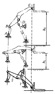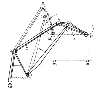 图(1)中,当机构各杆具有图示位置关系时,油缸1活塞杆的伸缩使起重臂2上的E点沿垂直线升降。图中h1、h2表示两个升高位置。 图(2)为起重机结构,取BC=0.27AB,CM=0.83AB,CD=1.18AB,AD=0.64AB,当主动件AB绕A转动到AB1位置时,象鼻梁3上的M点作近似直线移动到M1点,吊钩m同样移动到m1。 |