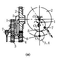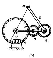 右图a,齿轮1的节圆直径等于齿轮2的节圆半径,齿轮2作为固定机架,齿轮3、4直径相等均与轴6用键连接,齿轮1、3、4与转臂5铰接。当转臂5绕O1转动时,齿轮1、3、4作行星运动。铰接于齿轮1节圆上的销7沿齿轮2的直径作直线运动。采用固定内齿轮传动也能得到直线运动,见往复运动机构(图行星齿轮简谐运动机构) 图b,齿轮1为固定机架,其中心O铰接转臂2,齿轮3、4与转臂2铰接,齿轮4的节圆直径等于齿轮1节圆半径,与转臂2等长的摆臂5与齿轮4固联。当转臂2绕O转动时,摆臂5的端点m在齿轮1的直径上作往复直线运动。 |