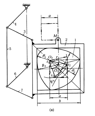 下图a,构件2、3、4、5、6、7和机架组成两个平行四边形,在边长为b的正方形导向框架2内有一等宽凸轮1(由四段 圆弧组成,即R1、R3、R2、R3),当凸轮绕固定点O2顺时针方向转动时,框架2上的M点,作边长为 轨迹。设t1、t2、t3为钻头的三个刀刃,它们组成一个等边三角形,其边长r=a,若钻头与等宽凸轮一起固连在钻杆上并绕固定点O1转动,则钻刃将在与框架2底板固联的工件(图中未示出)上钻出边长为a的正方形孔。根据所需的边长a,可求出其他尺寸: