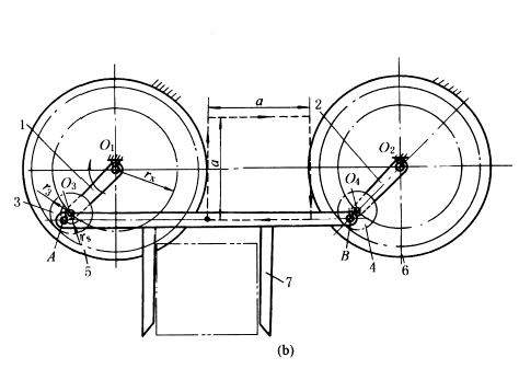 图b,长rx的转臂1、2分别绕O1、O2转动(其中一个为主动),使节圆半径均为r3的行星齿轮3、4绕尺寸相同的固定内齿轮5、6作行星运动。拨杆7铰接于行星齿轮3、4上的A、B点,AB=O1O2,且O3A=O4B=rs,则拨杆上任意点都随行星齿轮作近似方形轨迹运动。实现此轨迹的机构尺寸为rx=3r3=6rs。正方形的边长 |