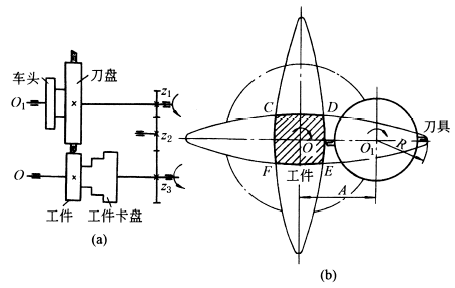 如图b,若把工件和刀具间的相对运动看成工件固定不动,而刀盘中心O1以工件的转速绕工件中心O反方向转动,同时刀盘还绕自己的中心O1以比工件快一倍的转速转动,那么刀盘上刀具的刀尖就在工件表面上形成椭圆轨迹,两把车刀的刀尖在工件表面上切出两个轴线互相垂直的椭圆,其长轴为A+R,短轴为A-R。切削后的工件轮廓CDEF就是由四段椭圆弧线所组成的近似正方形。当加大刀盘半径并减小刀尖与工件中心O的距离,则椭圆很扁,CDEF就愈接近正方形。 如果在刀盘上安装三把车刀,彼此夹角为120°,就能切削出正六边形的工件。 |