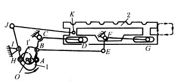 右图中,双联凸轮1和1' 绕O轴转动,送料台2沿近似矩形轨迹运动。其动作过程如下: 送料台2上升(下降)时,滚子H处于凸轮1' 的圆弧部分,杆HIJ不动,而滚子A在凸轮1的上升(下降)曲线的作用下,向右(左)摆,通过平行四边形机构BCEF及其延伸杆CD和FG将2举起(放下),这时,杆KJ绕J点上摆(下摆),因此送料台2运动轨迹的上升(下降)部分是一圆弧。送料台2水平向右(左)移动时,滚子A处于凸轮1的圆弧部分,机构ABCDEFG静止不动,而滚子H处于凸轮1' 的上升(下降)曲线部分,杆HIJ绕I点作顺(逆)时针方向摆动,杆JK推(拉)2向右(左)移动。 |