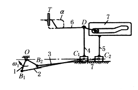 图(5)中,曲柄AB回转时,连杆BC上的E点形成图示轨迹,采用两套相同尺寸的曲柄摇杆机构,将它们连杆上的相应点E、E' 与输送机的推杆1铰接,这样,主动曲柄AB的回转可带动推杆按E点轨迹平动,利用轨迹上部近似水平段推送固定导杆2上的工件。 图(6)中,与齿轮1固联在偏心凸轮2绕A点转动时,使摆动导杆4在摇块3中绕B点摆动,导杆4左端的开口叉按图示轨迹α运送物料。此机构也可用于电影机的抓片机构。 |
