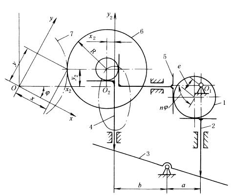 下图中,主动偏心轮1通过推杆2、杠杆3、推杆4和推杆5来控制砂轮6的轴心位置,使其按椭圆轨迹运动,其轴心方程为: x2=ecosnφ